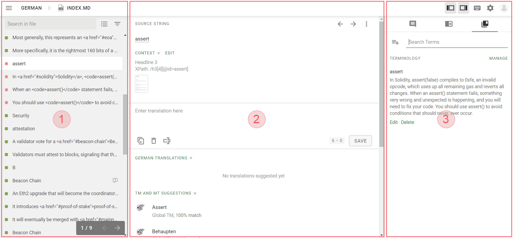 By using the buttons on top, you can also switch to the Translation Memory, where you can search for existing translations, or to the Glossary, which contains descriptions and standard translations of key terms.