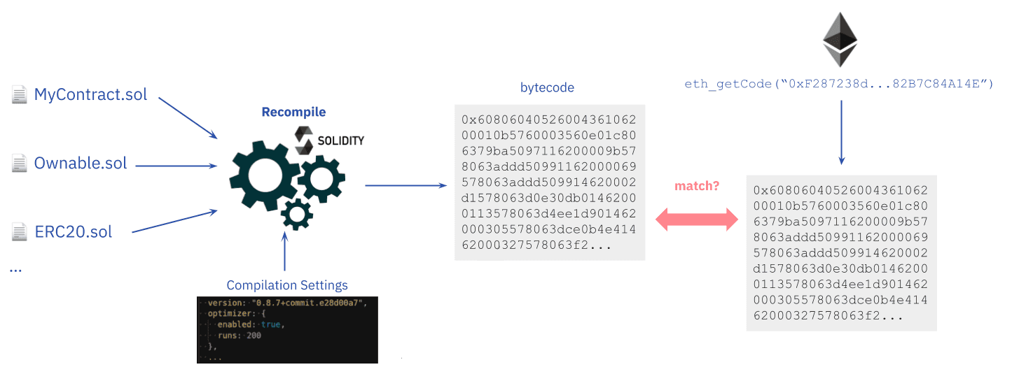 Source code verification is comparing a smart contractâs source code and the compiled bytecode used during the contract creation to detect any differences. Verifying smart contracts matters because the advertised contract code may be different from what runs on the blockchain.