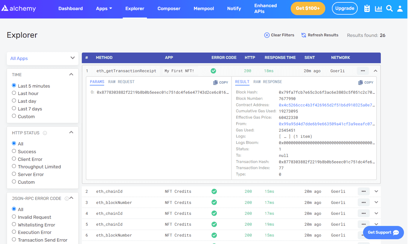 To understand what’s going on under the hood, let’s navigate to the Explorer tab in our Alchemy dashboard. If you have multiple Alchemy apps make sure to filter by app and select “MyNFT”.