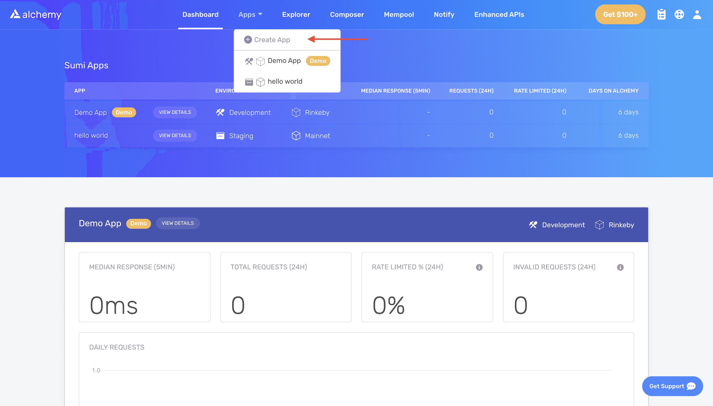 In this tutorial, we’ll also take advantage of Alchemy’s developer tools for monitoring and analytics to understand what’s going on under the hood in our smart contract deployment. If you don’t already have an Alchemy account, you can sign up for free here.