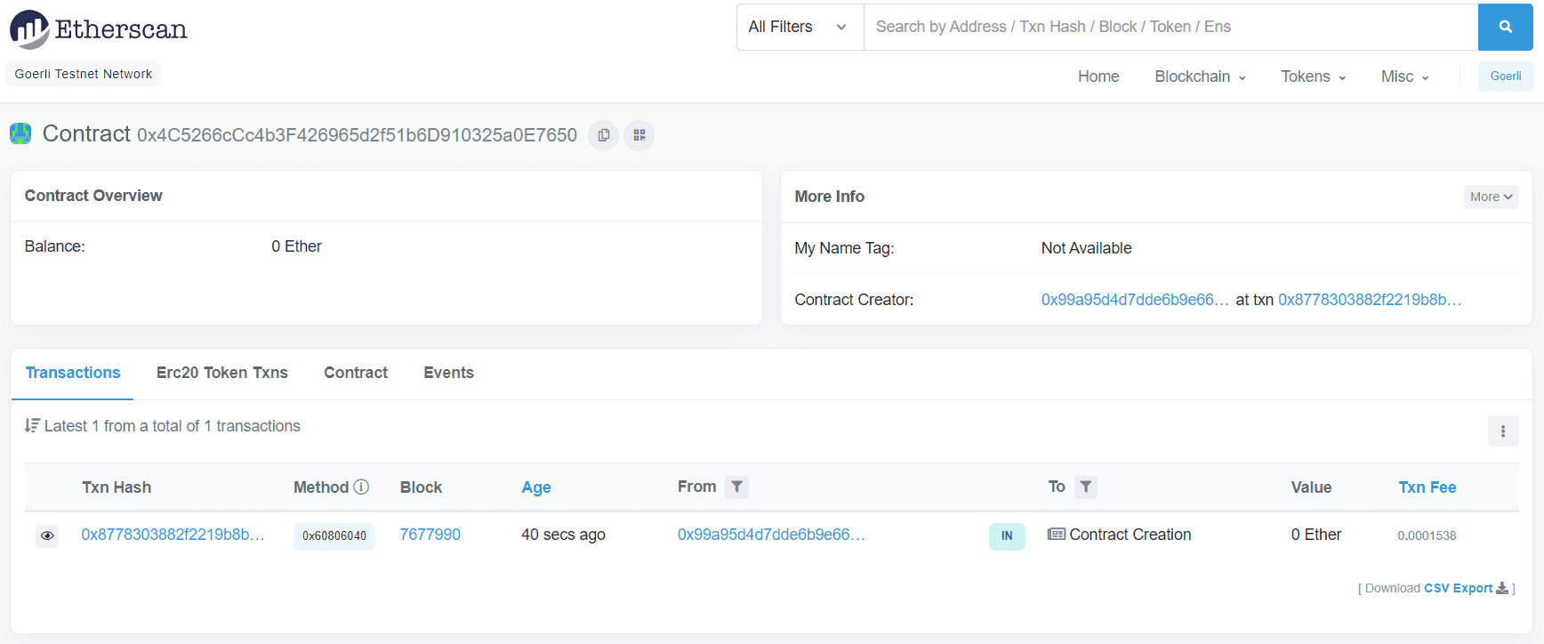 If we go to the Goerli etherscan and search for our contract address we should be able to see that it has been deployed successfully. If you can't see it immediately, please wait a while as it can take some time. The transaction will look something like this: