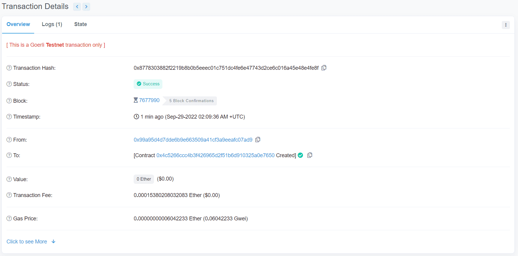 The From address should match your MetaMask account address and the To address will say “Contract Creation.” If we click into the transaction, we’ll see our contract address in the To field: