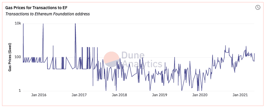 We can see gas prices paid for all transactions made to the Ethereum Foundation address over the years. Here is the query: