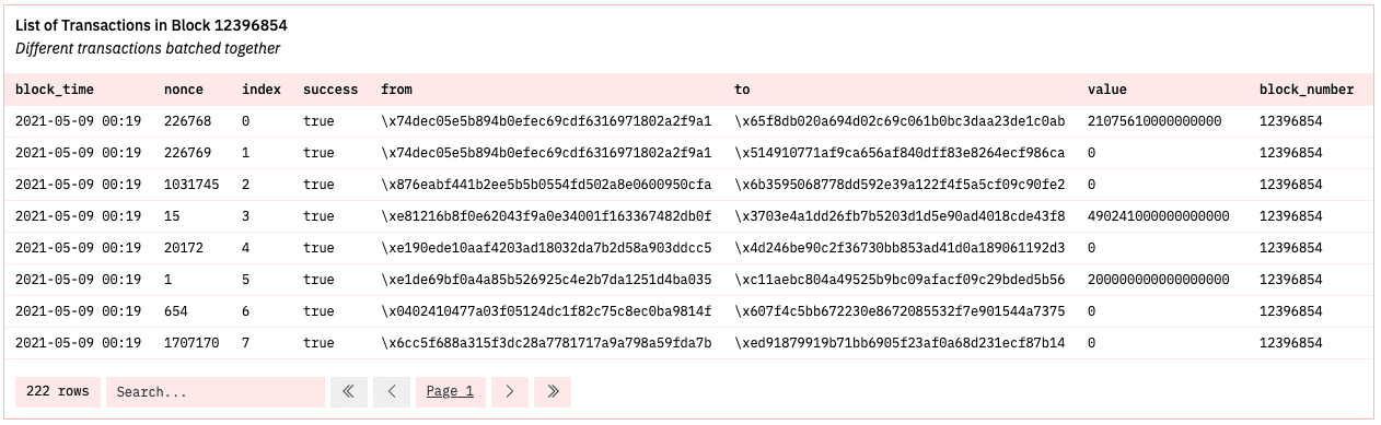 As stated above, each block contains a list of transactions, we can query this by filtering for a specific block. We'll try the most recent block, 12396854: