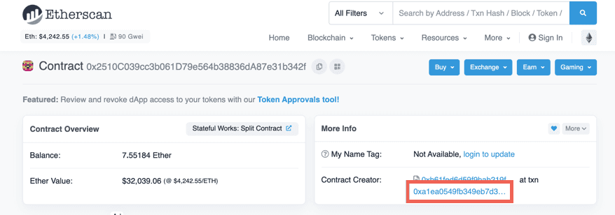 The bottom two lines tell us that Storage[2] is also a contract that we call. If we look at the constructor transaction we see that this contract is 0xc02aaa39b223fe8d0a0e5c4f27ead9083c756cc2, a Wrapped Ether contract whose source code has been uploaded to Etherscan.