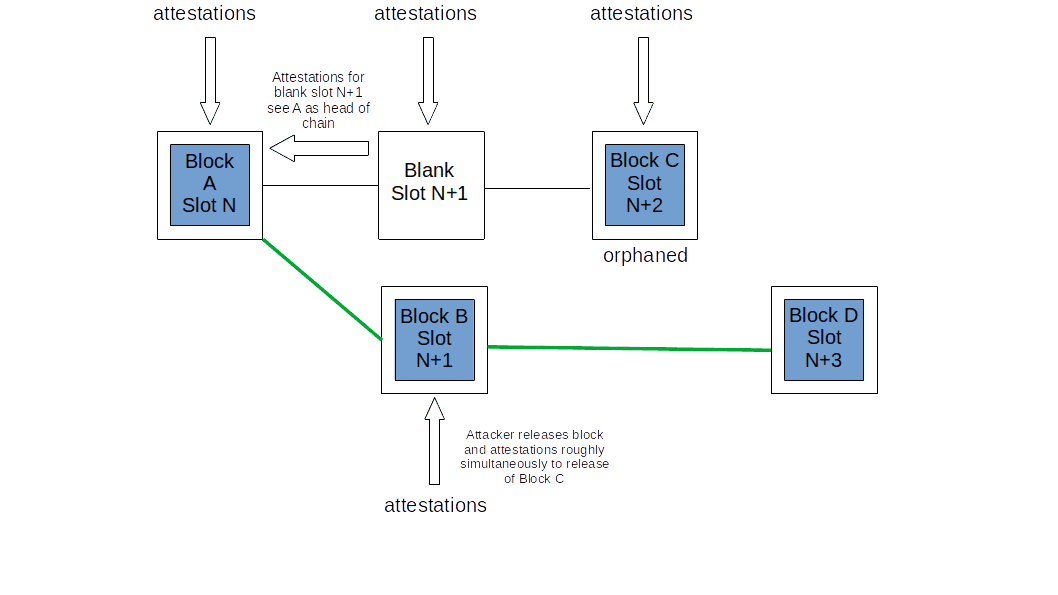 Several papers have explained attacks on Ethereum that achieve reorgs or finality delay with only a small proportion of the total staked ether. These attacks generally rely upon the attacker withholding some information from other validators and then releasing it in some nuanced way and/or at some opportune moment. They usually aim to displace some honest block(s) from the canonical chain. Neuder et al 2020 showed how an attacking validator can create and attest to a block (B) for a particular slot n+1 but refrain from propagating it to other nodes on the network. Instead, they hold on to that attested block until the next slot n+2. An honest validator proposes a block (C) for slot n+2. Almost simultaneously, the attacker can release their withheld block (B) and their withheld attestations for it, and also attest to B being the head of the chain with their votes for slot n+2, effectively denying the existence of honest block C. When honest block D is released, the fork choice algorithm sees D building on top of B being heavier than D building on C. The attacker has therefore managed to remove the honest block C in slot n+2 from the canonical chain using a 1-block ex ante reorg. An attacker with 34% of the stake has a very good chance of succeeding in this attack, as explained in this note. In theory, though, this attack could be attempted with smaller stakes. Neuder et al 2020 described this attack working with a 30% stake, but it was later shown to be viable with 2% of the total stake and then again for a single validator using balancing techniques we will examine in the next section.
