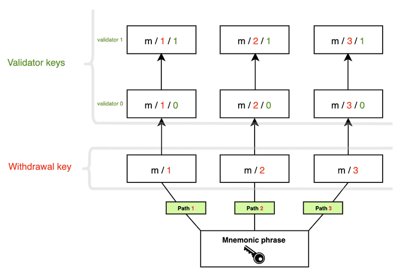 Each branch is separated by a / so m/2 means start with the master key and follow branch 2. In the schematic below a single mnemonic phrase is used to store three withdrawal keys, each with two associated validators.