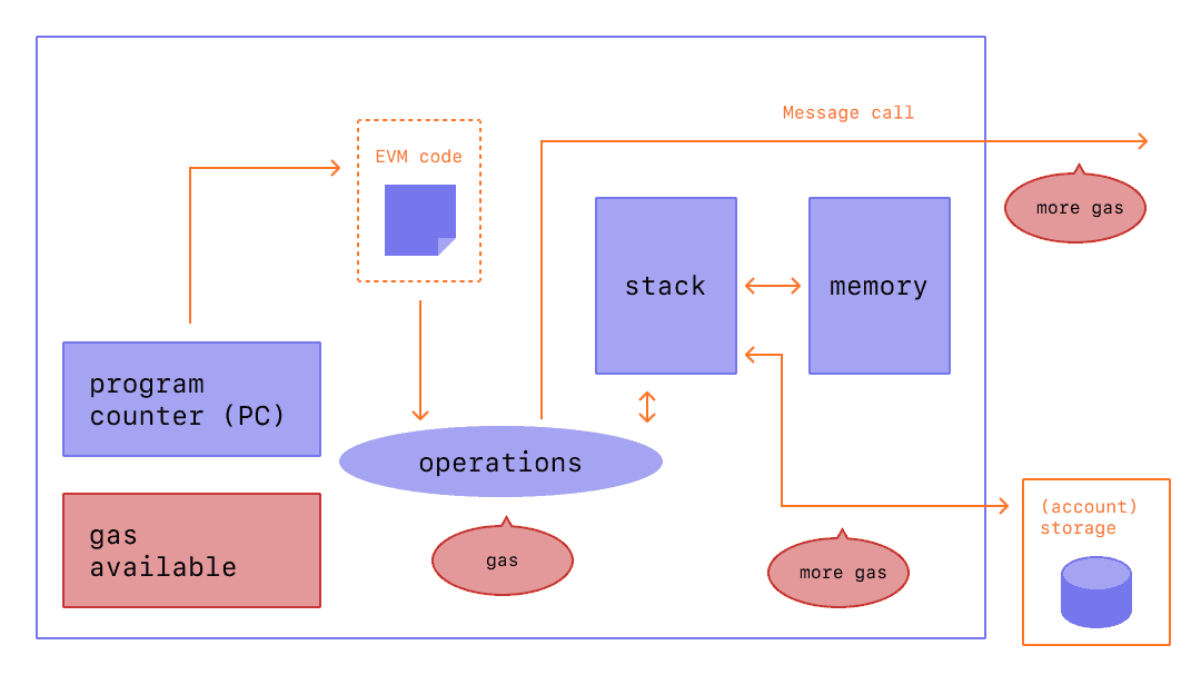 コンパイルされたスマートコントラクトのバイトコードは、XOR、AND、 ADD、 SUBのような標準的なスタック操作を行う多数の EVMオペコードとして実行されます。 また、EVM はADDRESS、BALANCE、BLOCKHASHなど、ブロックチェーン固有のスタック操作を多数実装しています。