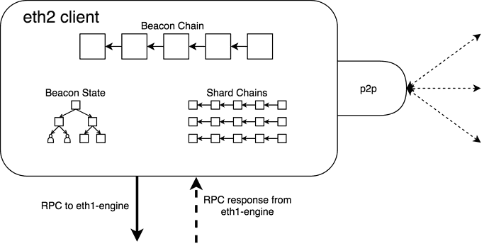 Both consensus and execution clients run in parallel. They need to be connected so that the consensus client can provide instructions to the execution client, and the execution client can pass bundles of transactions to the consensus client to include in Beacon blocks. The communication between the two clients can be achieved using a local RPC connection. An API known as the 'Engine-API' defines the instructions sent between the two clients. Since both clients sit behind a single network identity, they share an ENR (Ethereum node record) which contains a separate key for each client (eth1 key and eth2 key).