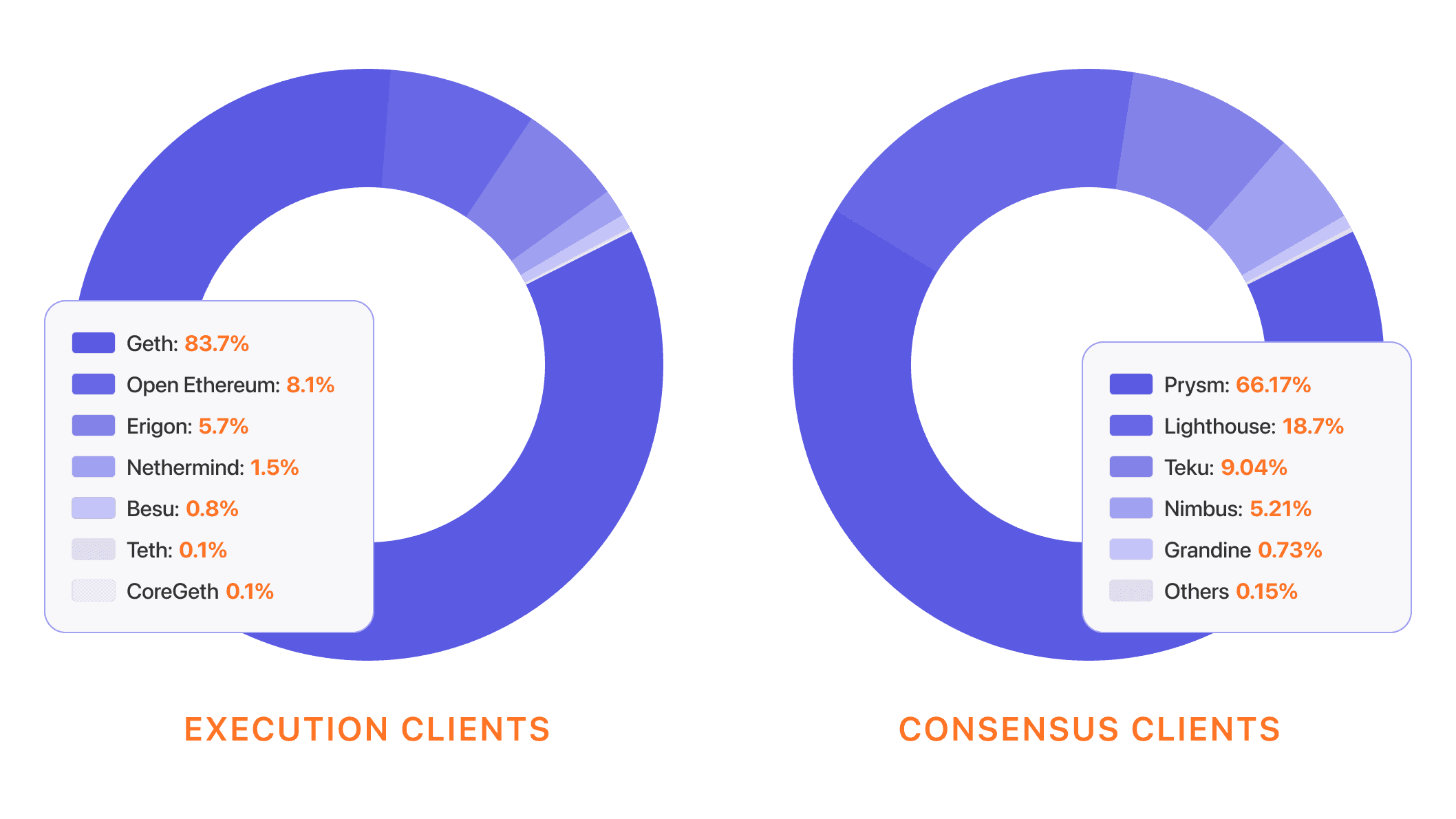 上の 2 つの円グラフは、実行レイヤーとコンセンサスレイヤーの現在(2022 年 1 月の執筆時点)のクライアントの多様性のスナップショットを示しています。 実行レイヤーの大多数はGethが占めており、1 位と大差をつけてOpen nexusが 2 位、次にErigon、Nethermindと続きますが、その他のクライアントはネットワークの 1%未満に過ぎません。 コンセンサスレイヤーで最も一般的に使用されているPrysmは、Geth ほど独占しているわけではありませんが、それでもネットワークの 60%以上を占めています。 LighthouseとTekuがそれぞれ約 20%と約 14%を占め、他のクライアントはほとんど使われていません。
