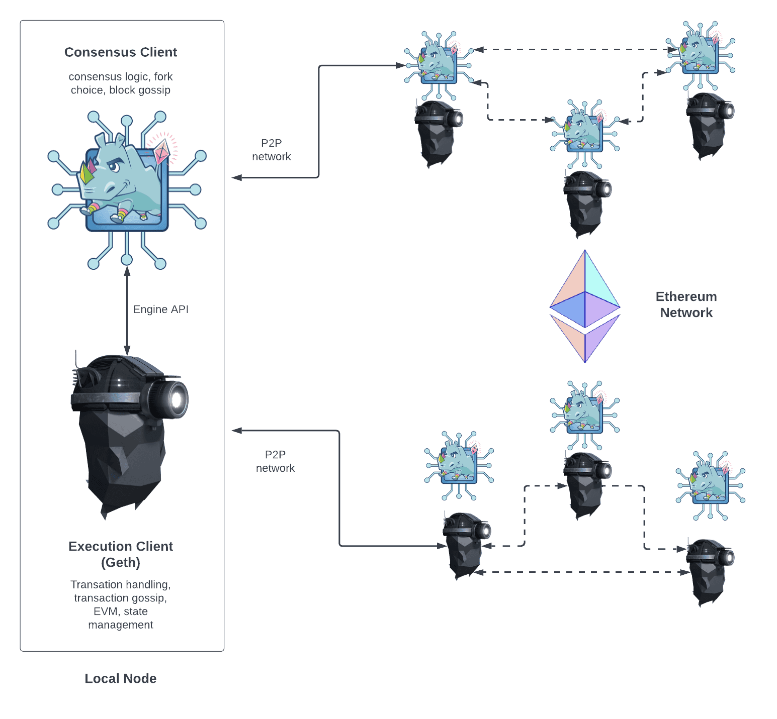 An Ethereum node is composed of two clients: an execution client and a consensus client.