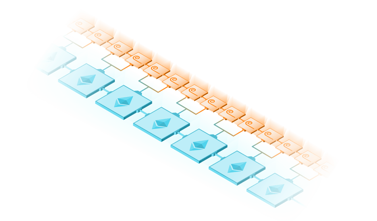 レイヤー2のブロックチェーンは、セキュリティと分散化を確保するため、イーサリアムと定期的に (トランザクションを一束にまとめて送信することで) 通信を行います。これらすべてで、レイヤー1のプロトコル (イーサリアム) に変更を加える必要はなく、レイヤー1がセキュリティ、データの可用性、および分散化を処理し、レイヤー2がスケーリングを処理します。