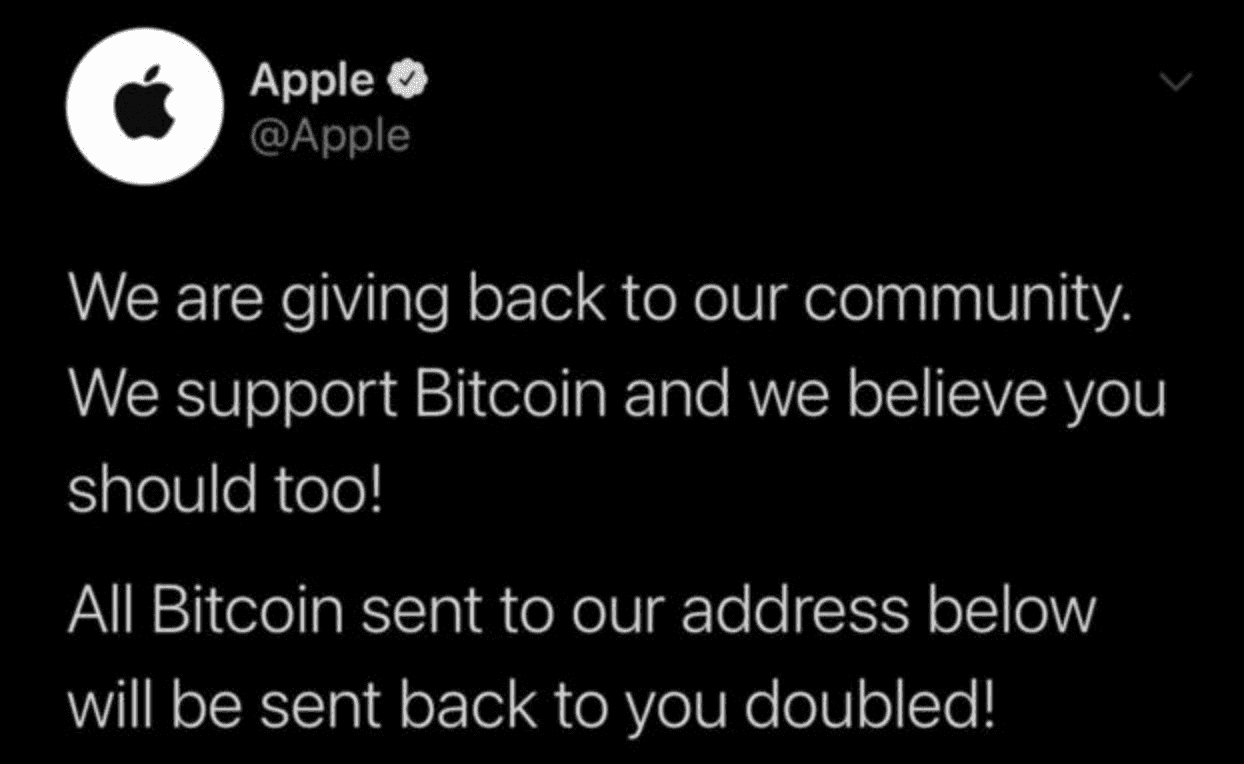 この種の詐欺で注目を集めたのは、2020 年 7 月に著名な有名人や組織の Twitter アカウントがハッキングされ、 ハッカーが著名人を騙りハッキングしたアカウントでビットコインのプレゼント告知を投稿した事件です。 詐欺のツイートはすぐに気づかれ、削除されましたが、ハッカーは 11 ビットコイン(2021 年 9 月時点で 50 万ドル)を持ち逃げしました。